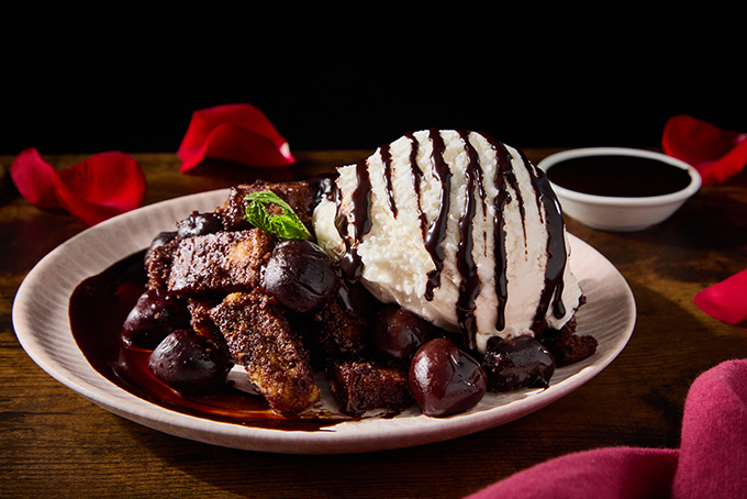 Dark chocolate sauce folded with cherries and cinnamon bread pudding / vanilla ice cream / chocolate sauce poured tableside