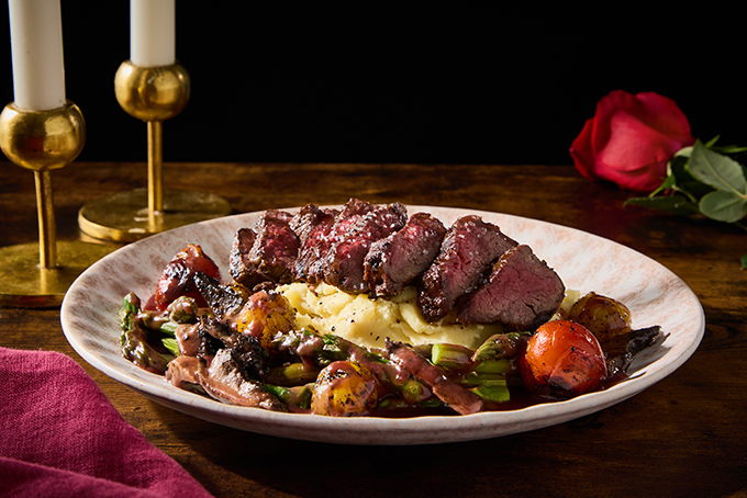 Wood grilled petite tenderloin / port wine sauce / mushrooms / asparagus / blistered tomatoes / Parmesan mashed potatoes