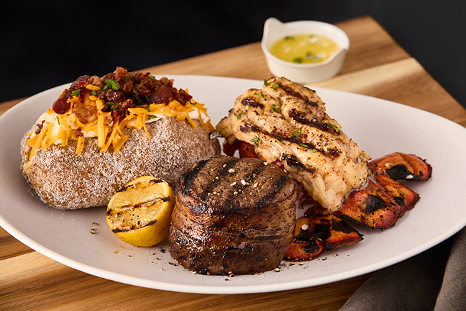 Half-pound lobster tail / bacon-wrapped filet / side