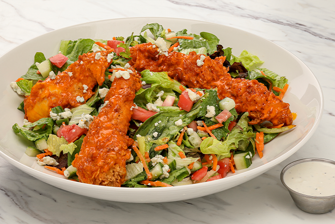 Mixed greens / carrots / cucumbers / tomatoes / bleu cheese crumbles / hand-breaded chicken tenders / housemade buffalo sauce; Chef recommends bleu cheese dressing