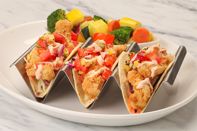 Grilled or crispy / cabbage / charred corn salsa / spicy sriracha sour cream