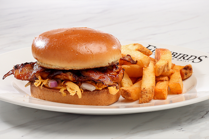 Firebirds half-pound burgers are made from a proprietary grind of ground beef and chuck, seared to perfection on our woodfire grill. Always fresh, never frozen. Served with your choice of seasoned steak fries, tater tots, fresh fruit, or cider slaw. Add a Small Caesar, Mixed Greens or BLT Salad or a cup of soup for an additional cost.