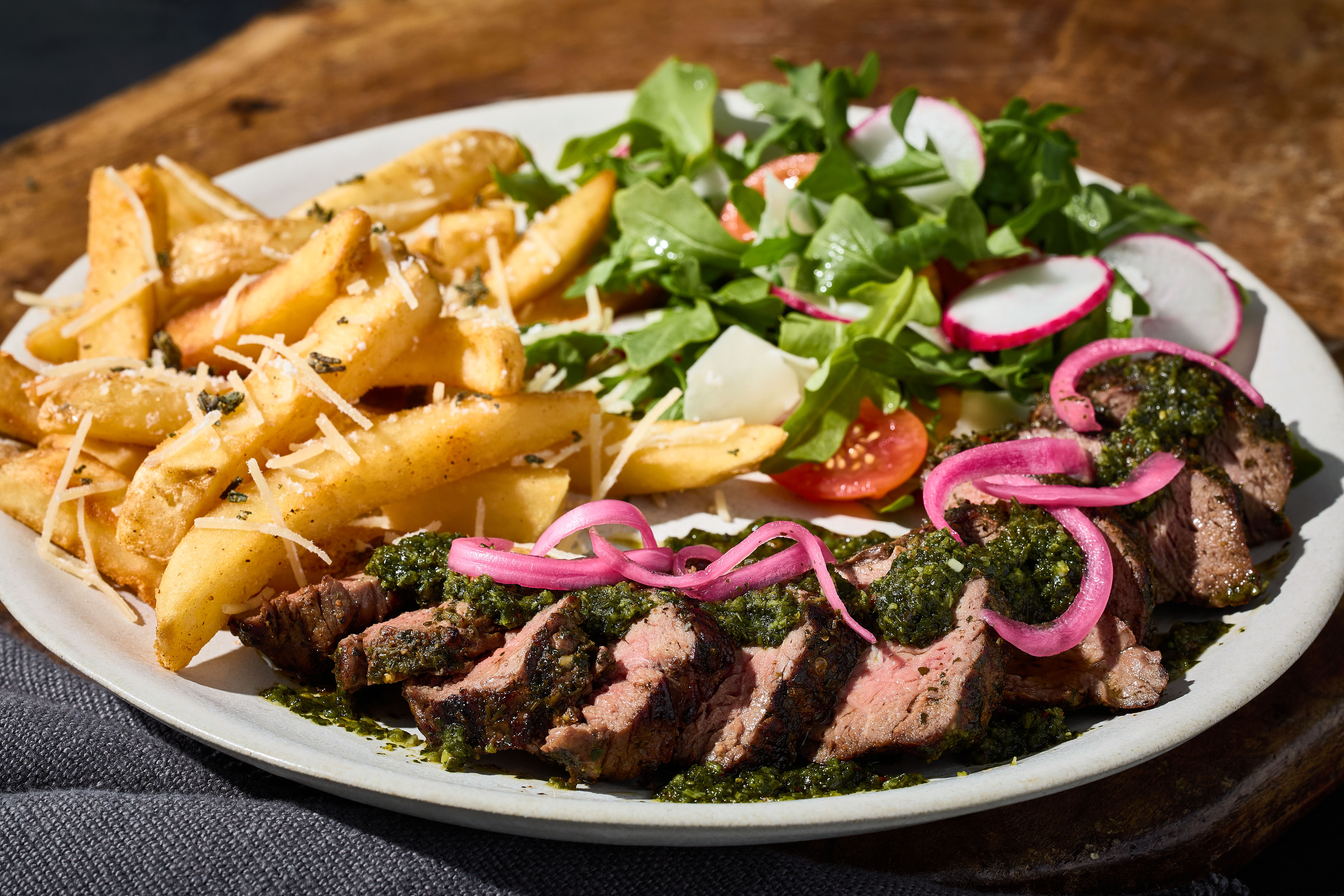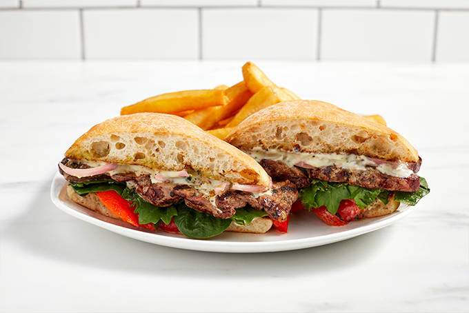 Ribeye / arugula / cilantro mayo / roasted red pepper / pickled onions / chimichurri sauce / ciabatta