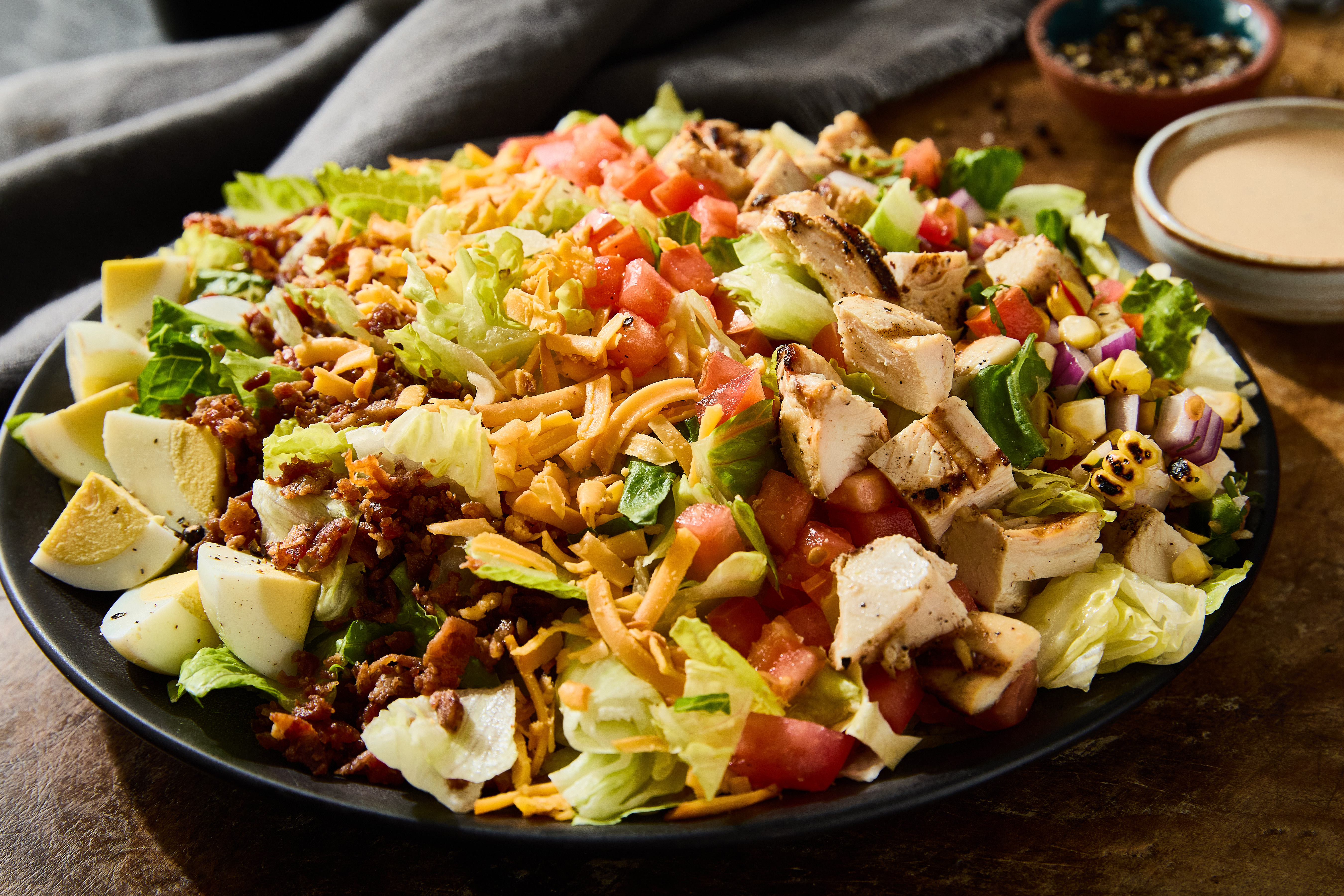 Wood grilled chilled chicken / romaine / iceberg lettuce / tomatoes / sliced egg / smoked cheddar / applewood-smoked bacon / charred corn salsa; Chef recommends chipotle ranch