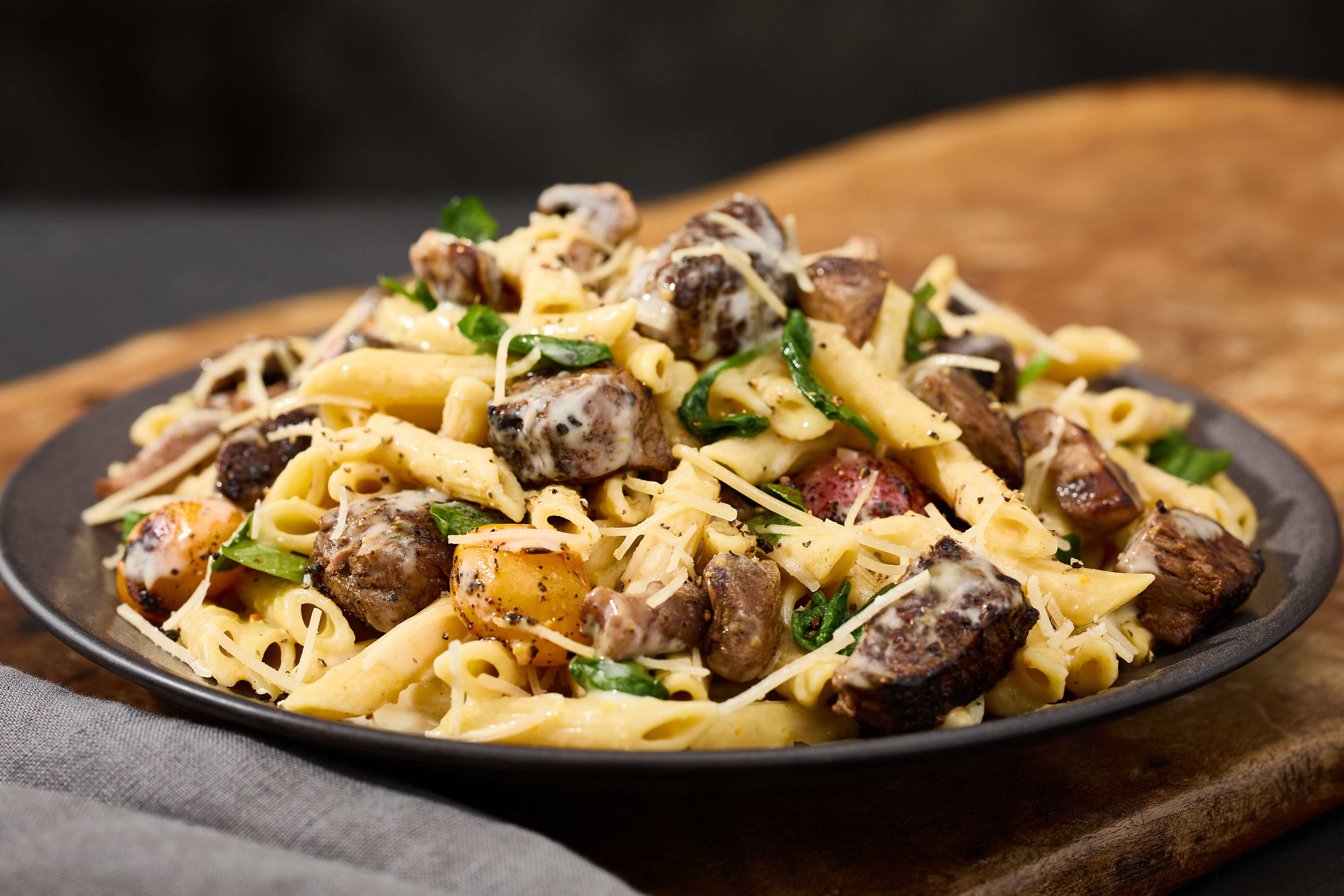 Steak / penne / roasted mushrooms / blistered tomatoes / fresh spinach / Aji-Amarillo Parmesan cream