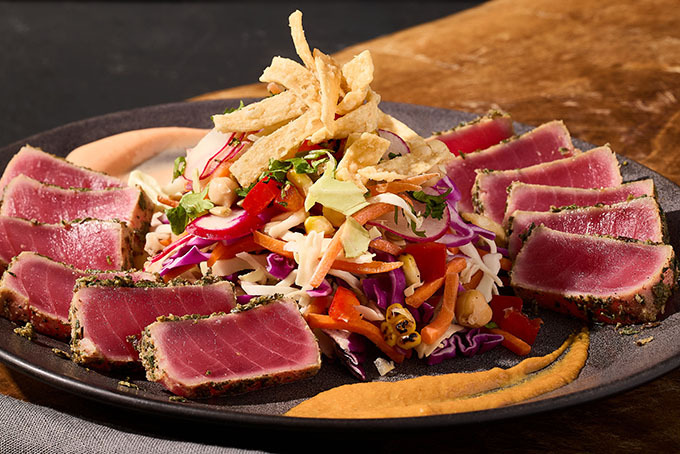 Seared sushi-grade tuna / spinach / organic ancient grains / cucumbers / radish / avocado / grilled corn / edamame; Chef recommends cilantro lime vinaigrette